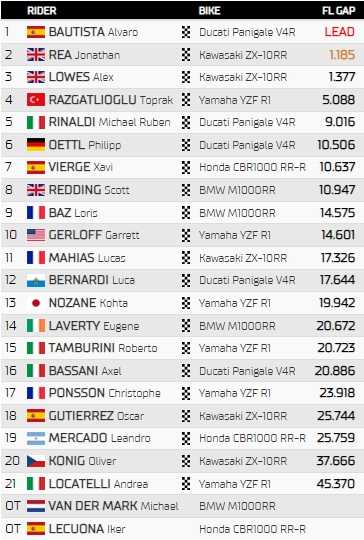 Deuxième après s’être défait de son coéquipier Alex Lowes dans le dernier tour, Jonathan Rea termine à une seconde de son adversaire, plus que jamais leader du championnat. Alvaro Bautista compte en effet désormais 50 points d’avance sur son dauphin, Toprak Razgatlioglu, quatrième du « sprint ». Le Turc a sauvé ce qu’il pouvait en battant Michael Ruben Rinaldi, cinquième.