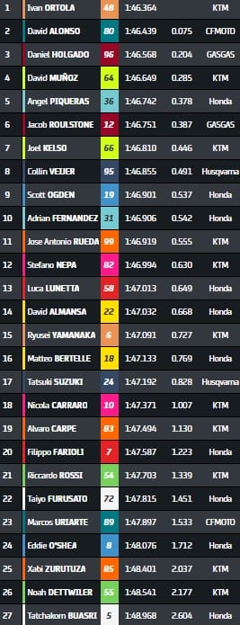 Les séances d'essais de la catégorie Moto3 sont terminées. Ivan Ortola termine avec le meilleur temps combiné devant David Alonso et Daniel Holgado. Les 14 premiers iront directement en Q2. Le Suisse Noah Dettwiler devra passer par la Q1.