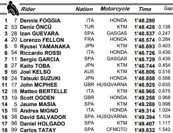 Dennis Foggia prendra le départ du Grand Prix de Catalogne depuis la pole position, sur les terres du leader du championnat, Sergio Garcia, qualifié septième. Le Français Lorenzo Fellon a brillé et ouvrira la deuxième ligne, signant là la deuxième meilleure performance de sa carrière en qualification.