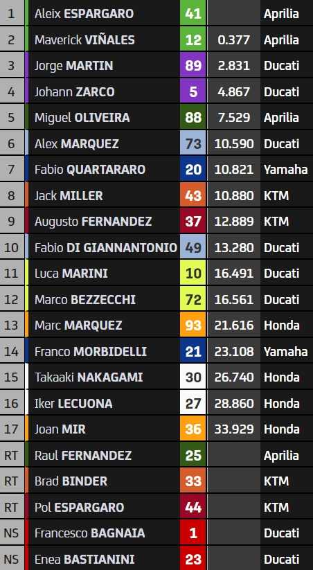 L’Espagnol et Franco Morbidelli (quatorzième) restent les seuls pilotes à avoir marqué des points à chaque Grand Prix cette saison. Percuté au premier départ, Marco Bezzecchi est visiblement reparti avec sa seconde machine et elle ne lui allait pas. L’Italien sauve les 4 unités de la douzième place et devance le local de l’étape, Marc Marquez, premier pilote Honda mais seulement treizième.
