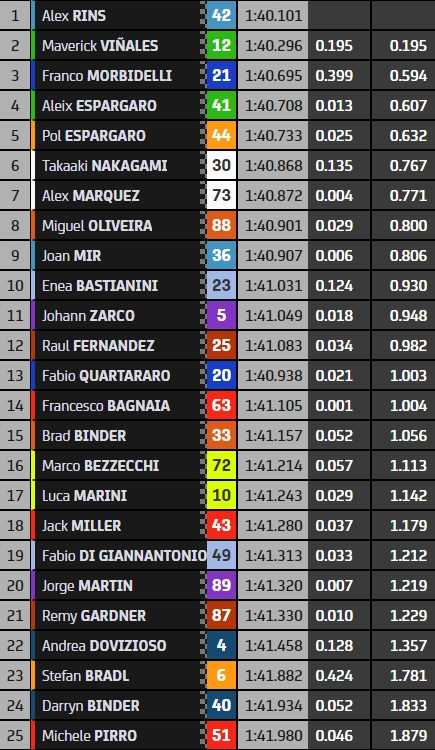 Derrière le leader, les Aprilia RS-GP vont toujours aussi bien. La preuve avec le deuxième chrono de Maverick Viñales à 195 millièmes du meilleur temps de la séance. Son coéquipier Aleix Espargaro est déjà bien placé. Le Catalan évolue aussi à domicile et se classe quatrième à 6 dixièmes d’Alex Rins.