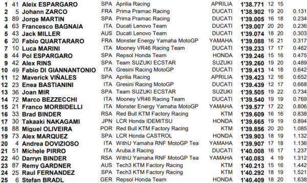 Fabio Quartararo accédera aussi directement à la Q2. Le champion du monde en titre termine sixième à 317 millièmes d’Espargaro. Le Français porte une nouvelle fois tous les espoirs de Yamaha puisque Franco Morbidelli n’est que 15e. Chez RNF, Andrea Dovizioso et Darryn Binder terminent aux vingtième et vingt-deuxième positions.