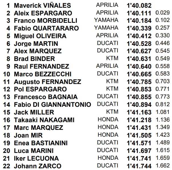 Les pilotes officiels Aprilia Maverick Vinales et Aleix Espargaro ont dominé le warm-up du Grand Prix de Catalogne, devant les Yamaha de Franco Morbidelli et Fabio Quartararo. Les chronos de la séance étaient relativement lents et la course devrait être une autre histoire.