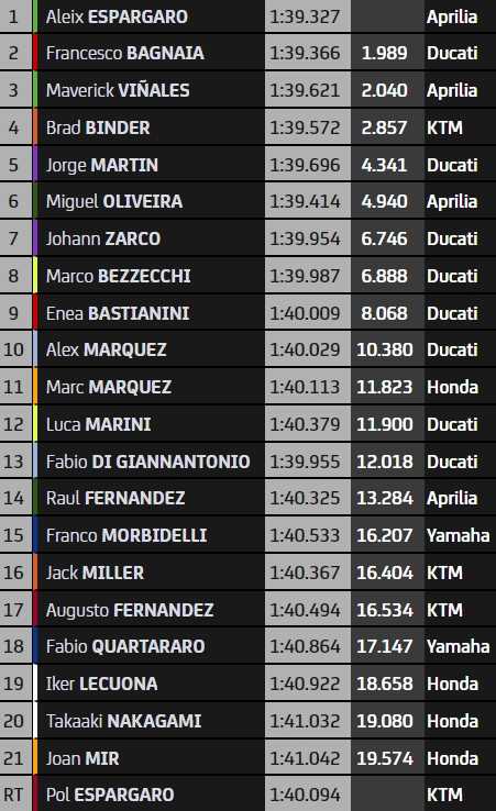 Bagnaia augmente son avance au championnat sur Martin de 62 à 66 points. Vainqueur, Espargaro chipe la cinquième place à Zarco.
