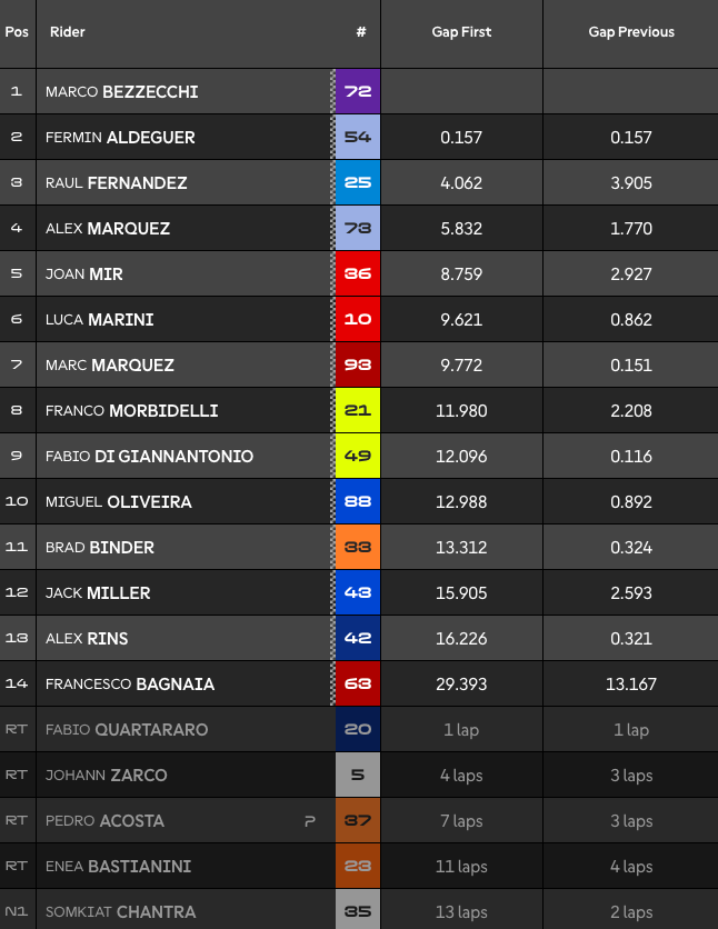 La domination du pilote italien prive Fermin Aldeguer de la première place. Le Rookie a longtemps mené le Sprint avant de se faire dépasser dans le dernier tour. Il reste le meilleur pilote Ducati hier et aujourd'hui.
