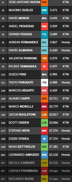 - La bagarre pour le podium a été aussi splendide que disputée. Le jeune prodige Maximo Quiles arrache la 2e place à David Muñoz. Angel Piqueras finit au pied du podium, pour un top-4 100 % espagnol. L'Italien Dennis Foggia (5e) est le battu de ce peloton.