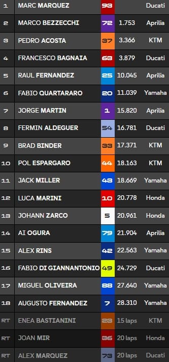 - Excellent au guidon de son Aprilia, Bezzecchi (2e) signe son 3e podium de l'année devant Pedro Acosta (3e), qui enlève le premier de KTM. L'Espagnol a résisté à Bagnaia (4e), à nouveau décevant. Raul Fernandez (5e) signe son meilleur résultat en MotoGP et place une deuxième Aprilia dans le top-5.