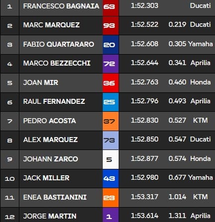 Passé par la Q1, Francesco Bagnaia a rebondi avec force en allant chercher la pole position du Grand Prix de Tchéquie. Il partira devant son coéquipier Marc Marquez, qui était en avance mais a tout perdu en chutant dans l'avant-dernier virage. Fabio Quartararo complète la première ligne tandis que son compatriote français Johann Zarco (9e) est tombé, une fraction de seconde avant Marquez.