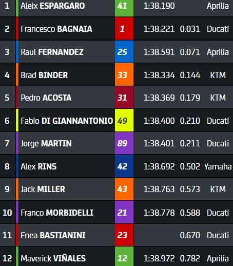 Descendu en 1'38.190, Espargaro bat de 31 petits millièmes Francesco Bagnaia, et établit au passage le nouveau record du circuit. Vainqueur ici-même en 2023, il est l'homme à battre pour le moment. Raul Fernandez insère une deuxième Aprilia en première ligne et signe la meilleure qualification de sa carrière.