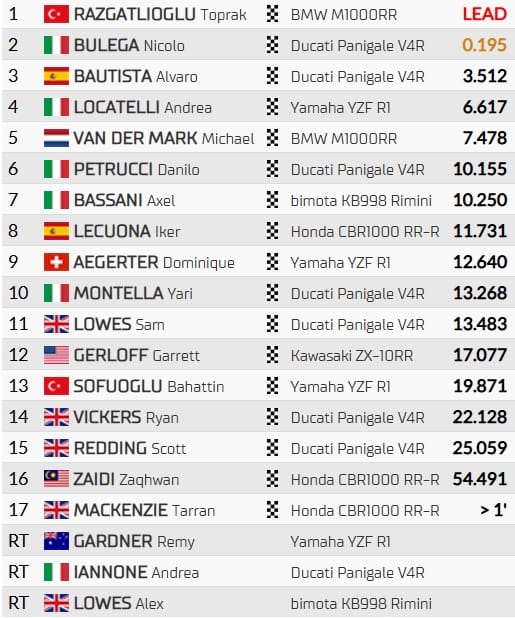 Nicolo Bulega (2e) a tout tenté mais Toprak Razgatlioglu (1er) était trop fort à Portimao. Le Turc a complété son triplé du week-end devant l'Italien, à l'issue d'un nouveau duel de toute beauté. Alvaro Bautista (3e) complète le podium derrière son coéquipier de chez Ducati. Andrea Locatelli (4e) et Michael van der Mark (5e) glissent leur BMW et Yamaha dans le top-5.