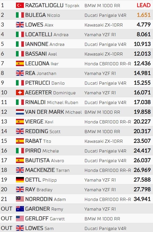 Doublé par Nicolo Bulega lors du premier tour, Razgatlioglu a répliqué quelques minutes plus tard. Il s'est ensuite mis à l'abri de toute attaque de l'Italien, l'emportant pour 1,6 seconde. Un succès qui conforte sa place de leader du championnat car son dauphin Alvaro Bautista a chuté alors qu'il était troisième. L'écart bondit donc de 3 à 15 points avant la dernière manche du week-end.