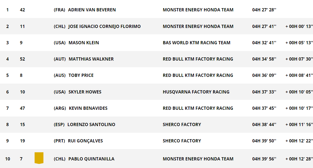 Matthias Walkner et sa KTM terminent 4e à 7’30 devant Toby Price (+8’31). Vainqueur hier, Joan Barreda a eu plus de mal, notamment dans la navigation, et finit à une lointaine 14e place (+14′). Le leader du général a connu encore plus de difficultés. Daniel Sanders n’est que 21e à 26’56 d’Adrien Van Beveren.