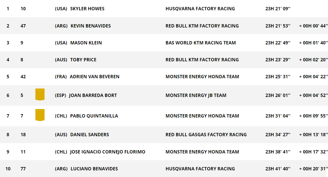 Au classement général, la mauvaise journée de Daniel Sanders laisse les commandes à Skyler Howes. Kevin Benavides est deuxième à seulement 44 secondes du nouveau leader. Grâce à sa nouvelle bonne performance, Mason Klein revient sur le podium virtuel à 1’40 de son compatriote. Toby Price est 4e (+2’20) devant le vainqueur du jour, Adrien Van Beveren. Le Français fait une très bonne opération et pointe à seulement 4’22 de Skyler Howes. Joan Barreda perd du temps et se retrouve 6e à 4’52. Grand perdant du jour, Daniel Sanders dégringole à la 8e position avec plus de 13 minutes de débours sur le leader.