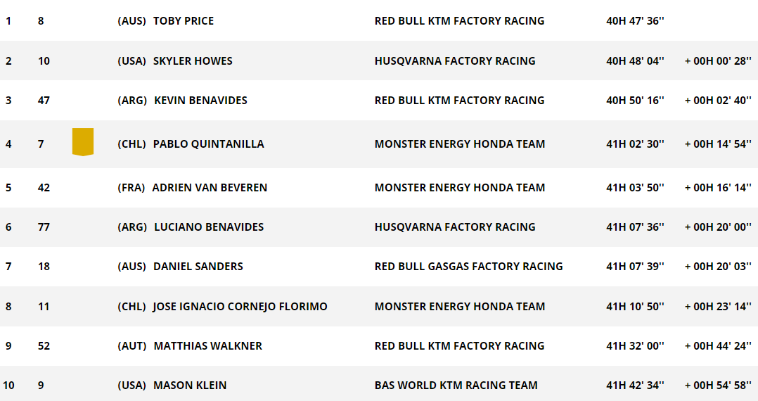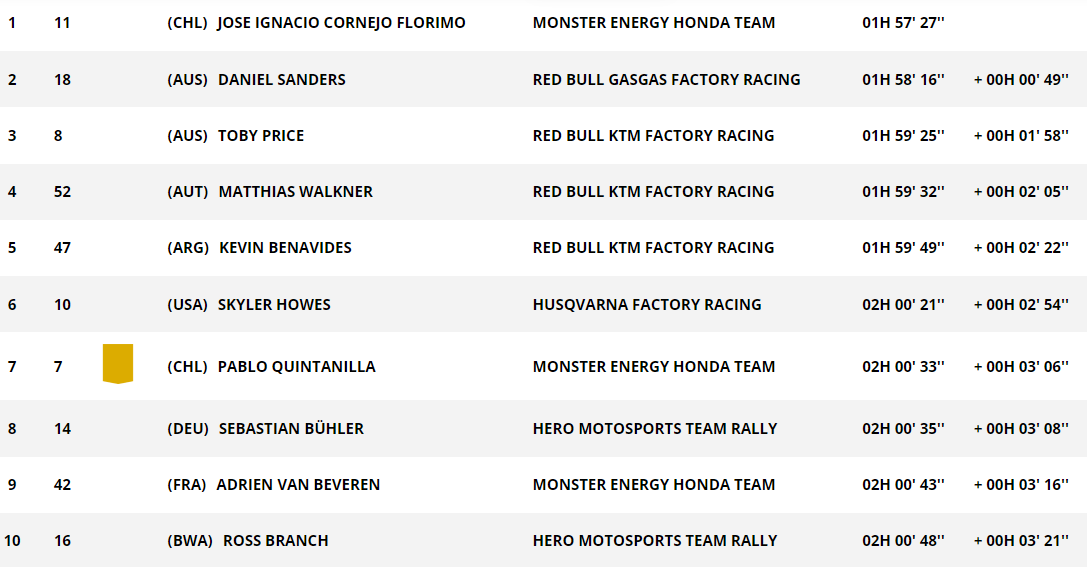 Parmi les hommes forts du général, Kevin Benavides se classe 5e (+2’22) juste derrière Matthias Walkner. Skyler Howes est 6e à un peu moins de trois minutes. Adrien Van Beveren est dans le top-10 du jour. Le Tricolore pointe au 9e rang à 3’16.