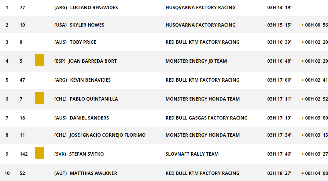 Derrière, les écarts sont minimes. Toby Price, 3e, est à 2’20 tandis que José Ignacio Cornejo, 8e, pointe à 3’15. Entre les deux hommes, Joan Barreda, Kevin Benavides, Pablo Quintanilla et Daniel Sanders ont joué groupés. Vainqueur la veille, Adrien Van Beveren a dû ouvrir la piste. Le Français s’en est bien sorti et termine 11e à seulement 4’22. Le Californien Mason Klein est tombé à deux reprises mais se classe 12e (+7’30).