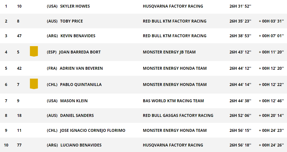 Au général, Skyler Howes conserve la tête du classement devant Toby Price (+3’31) et Kevin Benavides (+7’01). Adrien Van Beveren reste 5e à 12’20, avec seulement deux secondes d’avance sur Pablo Quintanilla. Mason Klein est 7e (+12’46) alors que Daniel Sanders le suit à plus de 20 minutes du leader.
