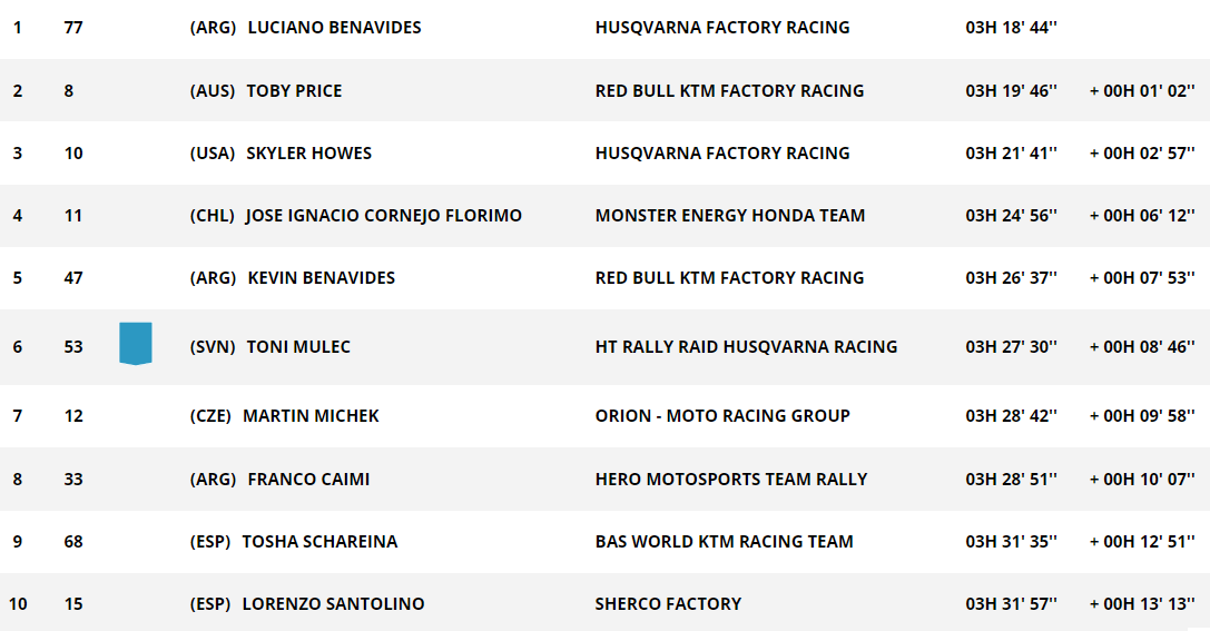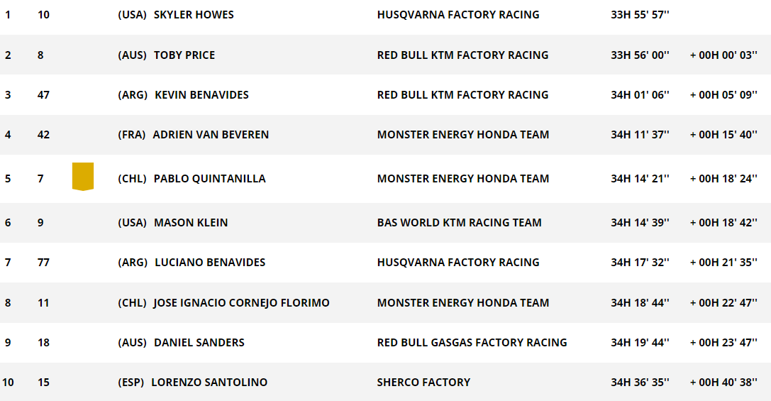 Au classement, Skyler Howes maintient sa place de leader pour seulement trois secondes devant Toby Price. Kevin Benavides est 3e à 5’09. Malgré sa spéciale moyenne, Adrien Van Beveren gagne une position. Le pilote Honda pointe à 15’40 de la tête au quatrième rang. Mason Klein chute à la 6e place avec 18’42 de débours sur son compatriote.