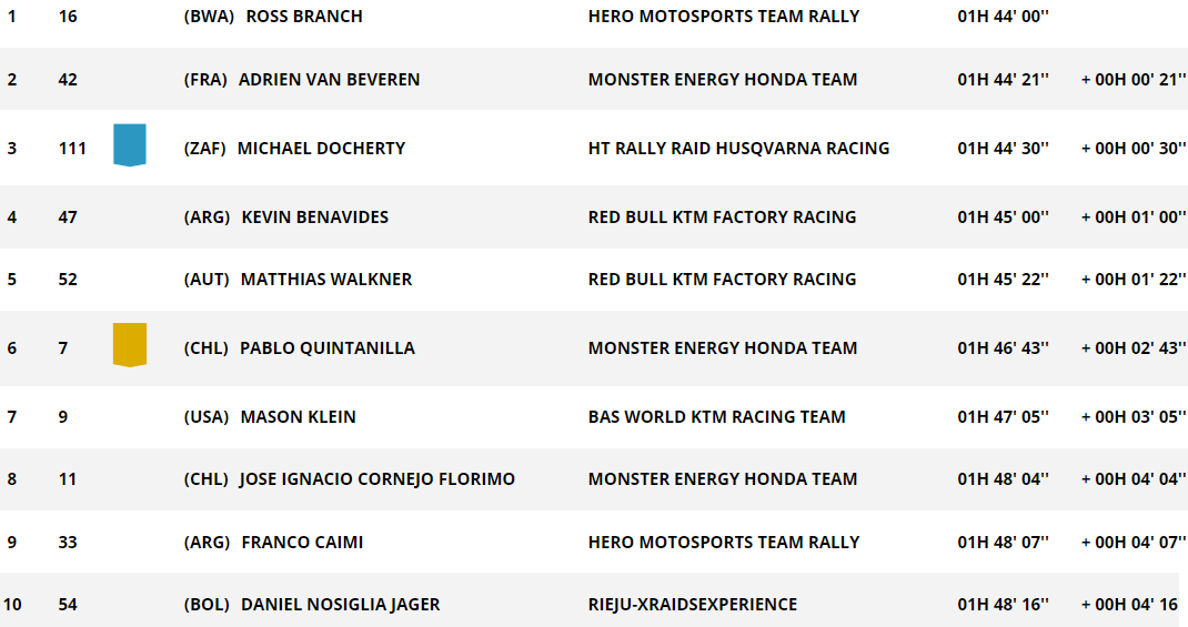 Au troisième rang, l’étonnant Sud-Africain Michael Doherty s’offre le podium de l’étape. Le pilote Husqvarna est pourtant engagé en Rally2 ! Kevin Benavides se classe 4e à 1’ du leader. Moins en vue que lors de la première semaine, Mason Klein est 8e à plus de trois minutes. Vainqueur hier, Toby Price est 18e à 8’16, juste derrière Skyler Howes (17e, +7’38).