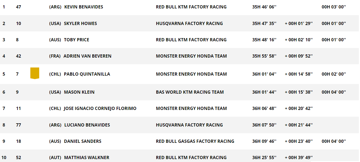 La nouvelle journée difficile de l’Américain lui fait perdre les commandes du général. Kevin Benavides s’empare de la place de leader et possède 1’29 d’avance sur Skyler Howes. Toby Price est 3e à 2’10. Quatrième, Adrien Van Beveren compte 9’52 de retard. Pablo Quintanilla complète le top-5 (+14’58).