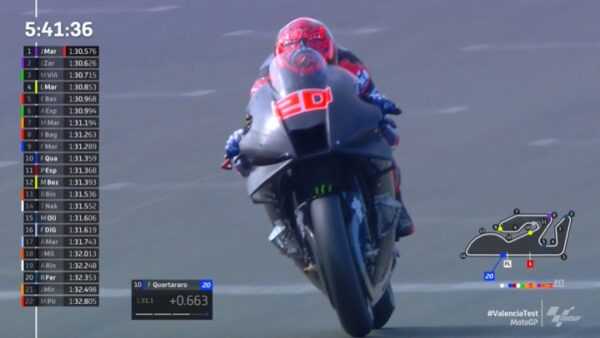 9h44 : Fabio Quartararo entre en scène avec la Yamaha YZR-M1. Le Niçois boucle ses premiers kilomètres sur la version 2022, histoire de prendre ses marques avant de grimper sur la 2023.