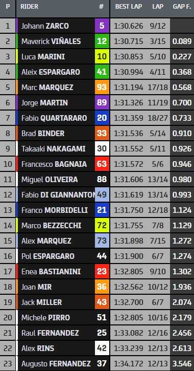 11h25 : Jorge Martin chipe le meilleur temps à son coéquipier Johann Zarco. 1’30.576 pour l’homme qui a signé la pole position du Grand Prix trois jours plus tôt.