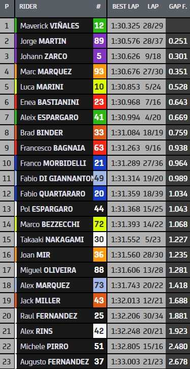 16h58 : Maverick Viñales reprend la deuxième place à Marco Bezzecchi. Avec Miguel Oliveira quatrième et Aleix Espargaro juste derrière, trois Aprilia RS-GP sont dans le top-5.
