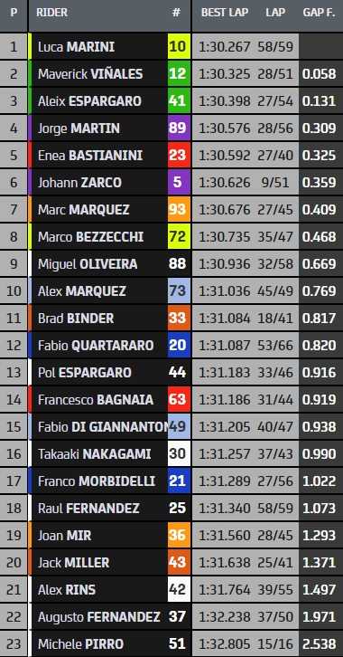 14h59 : Nouveau meilleur temps du jour pour Luca Marini en 1’30.267. Il devance Maverick Viñales de 58 millièmes.