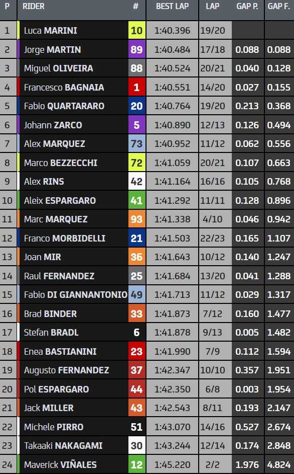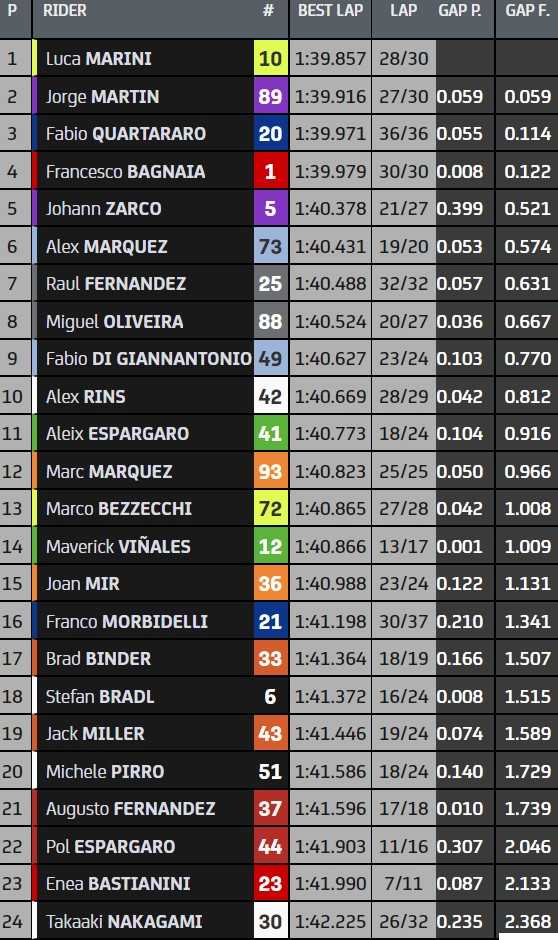 17h14 : Luca Marini (Ducati) enchaîne les tours rapides et descend en 1’39.005, pas loin de signer le premier chrono en 1’38 du week-end. L’Italien n’est plus qu’à 280 millièmes du record absolu de la piste, les 1’38.725 de Francesco Bagnaia réalisés en 2021.