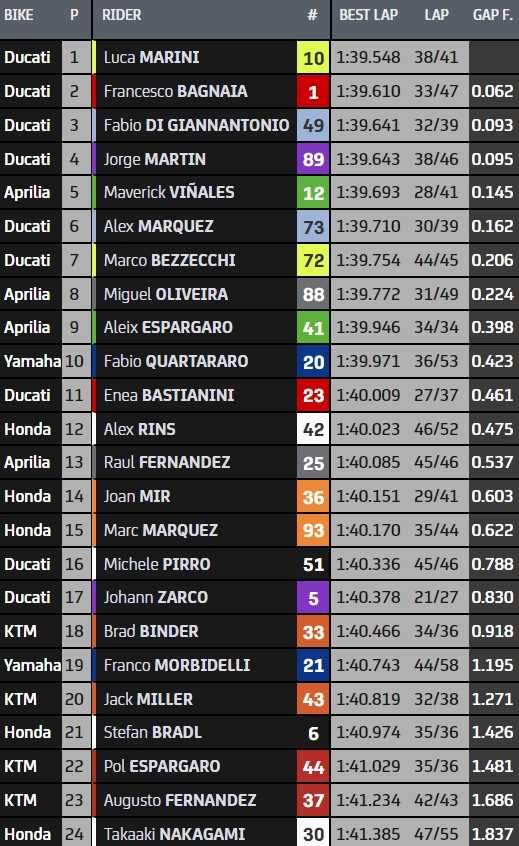 10h57 : Luca Marini (Ducati) est déjà de retour en piste et reprend la première place, mais cela ne devrait pas durer car Francesco Bagnaia (Ducati) est dans un tour rapide. On s’approche déjà du cap des 1’40.
