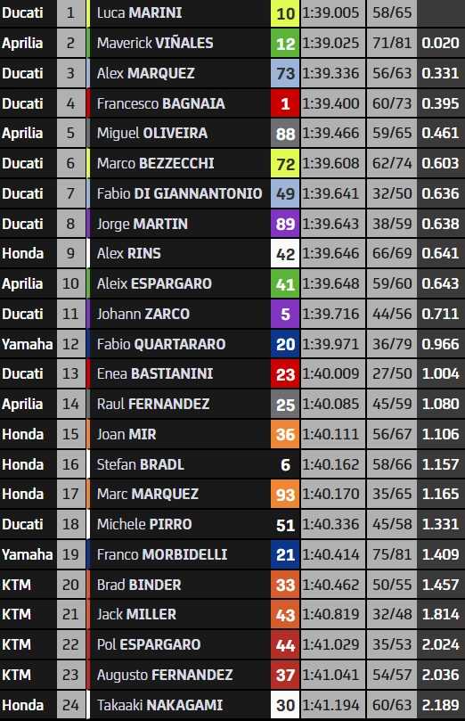 17h18 : Belle progression de Maverick Vinales (Aprilia) qui passe deuxième à 20 millièmes de Luca Marini. Alex Marquez (Ducati) se régale avec sa nouvelle machine et fait bonne figure au troisième rang. La première moto japonaise, la Honda d’Alex Rins, est neuvième.