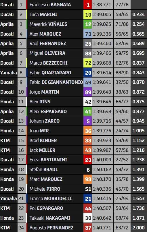 12h03 : Cinquième, Fabio Quartararo est le seul pilote équipe d’une moto japonaise dans le top-10. Les neuf autres pilotes disposent tous d’une Ducati ou d’une Aprilia. Les machines italiennes dominent la hiérarchie.