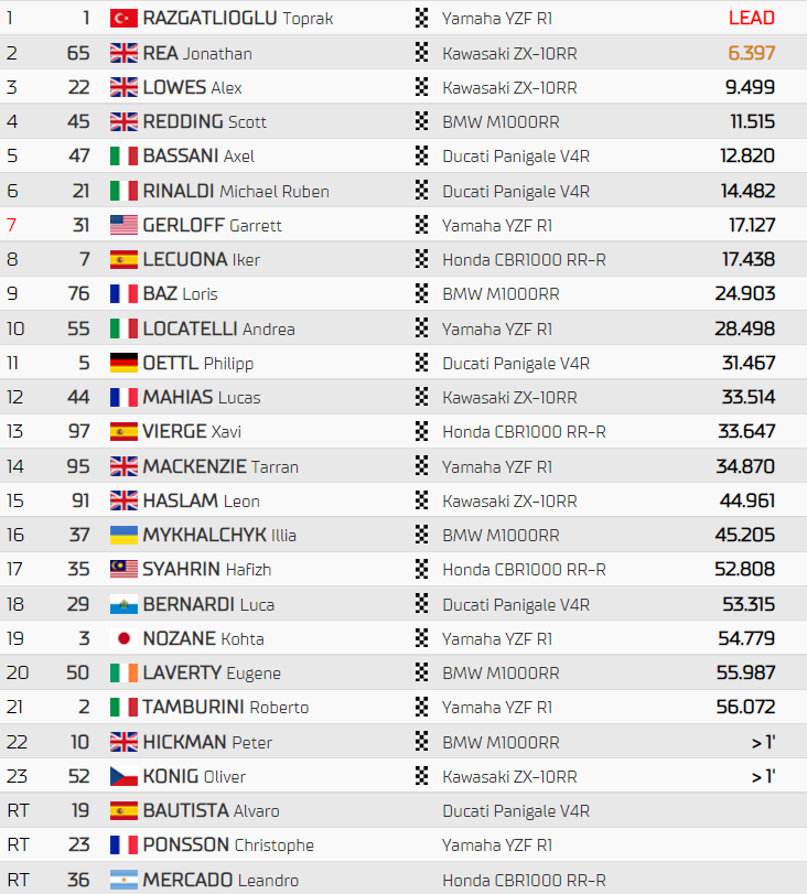 Alex Lowes met la pression à Scott Redding pour le podium. Les deux pilotes se livrent une bataille très musclée mais c’est finalement le pensionnaire de Kawasaki qui a le dernier mot et passe en troisième place. Toprak Razgatlıoğlu s’en va tranquillement chercher le drapeau à damiers devant Jonathan Rea et Axel Lowes. Loris Baz marque les points de la neuvième place, Lucas Mahias se classe douzième.