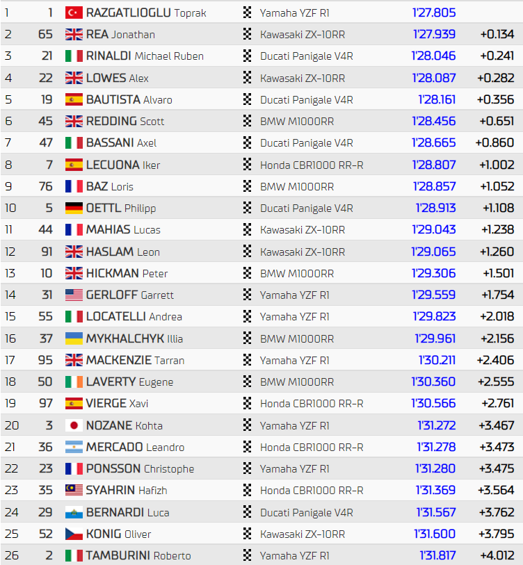 Grâce à un très bon chrono en toute fin de séance, Toprak Razgatlıoğlu s’est adjugé le meilleur temps des essais libres 1 à Donington. Le Turc devance le local de l’étape, Jonathan Rea et le pilote Ducati Panigale, Michael Rinaldi. Le leader du championnat, Alvaro Bautista est dans le coup en cinquième position. Côté Français, Loris Baz se classe neuvième tandis ce que Lucas Mahias échoue aux portes du top-10 (11e). De retour de sa blessure à la clavicule, Christophe Ponsson termine vingt-deuxième.