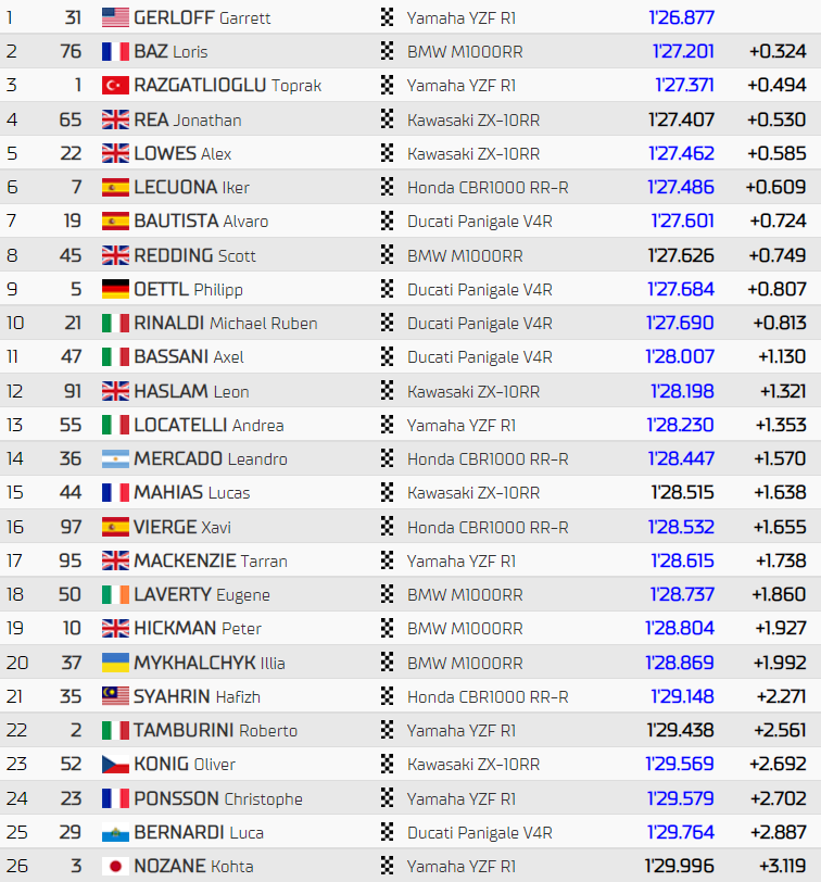 A quelques heures de la Superpole, le classement de la veille a été chamboulé. Ce matin, Garett Gerloff signe le meilleur temps. Le Français Loris Baz se classe à une très encourageante deuxième place. Toprak Razgatlıoğlu complète le trio de tête, juste devant le Britannique Jonathan Rea. Alvaro Bautista est plus en retrait avec le septième chrono. Les autres Français sont moins en vue. Lucas Mahias est quinzième, Christophe Ponsson vingt-quatrième.