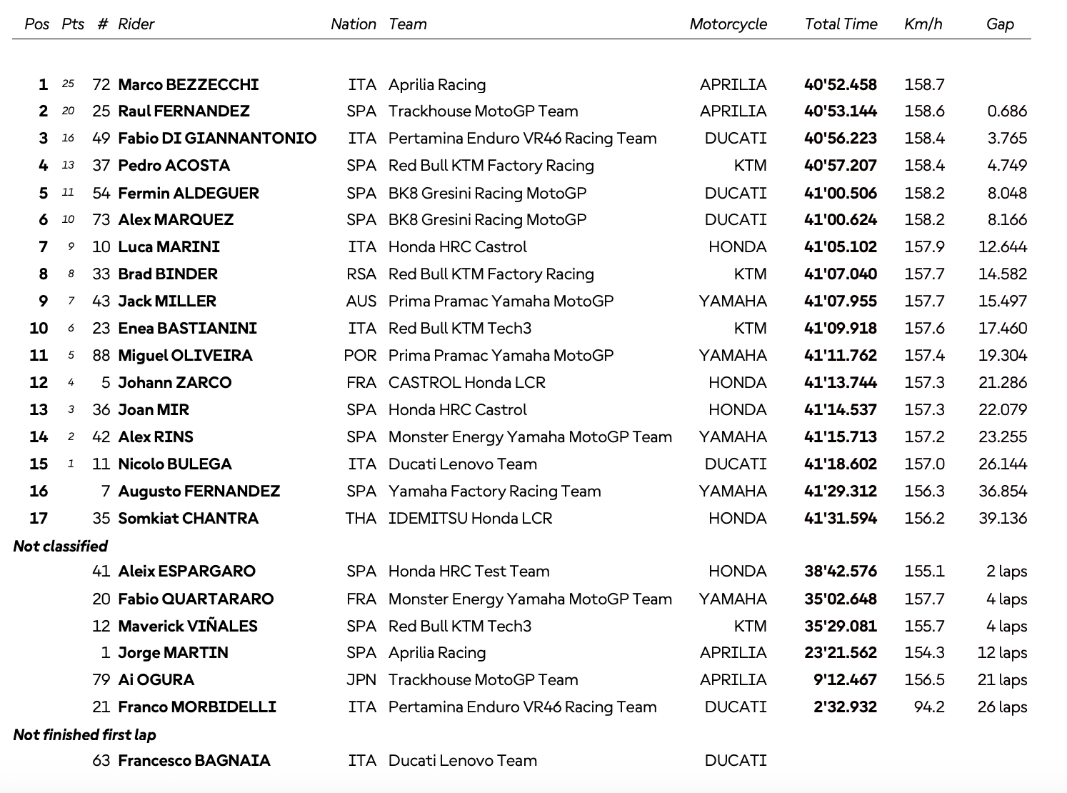 Pedro Acosta termine au pied du podium, suivi par Fermin Aldeguer et Alex Marquez. Luca Marini, premier pilote Honda à l'arrivée de ce Grand Prix grâce à sa septième position, permet au constructeur japonais de passer du rang D au rang C des concessions.