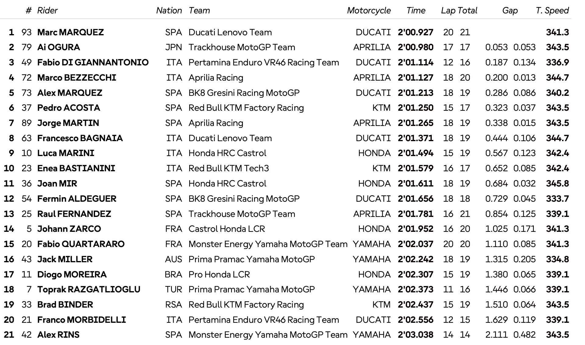 Le champion du monde en titre a tourné en 2'00.927, à moins d'un dixième du record du circuit qu'il détient (2'00.864). Il compte 53 millièmes d'avance sur Ai Ogura et un peu moins de deuxièmes sur Fabio Di Giannantonio, qui a chuté en début de séance.