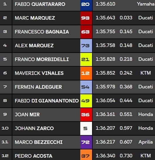- Les Ducati officielles de Marc Marquez (2e) et Francesco Bagnaia (3e) complètent la première ligne. Alex Marquez (4e) ouvrira la deuxième rangée devant Franco Morbidelli (5e) et Maverick Viñales (6e), meilleur pilote KTM du jour après avoir remporté la Q1.