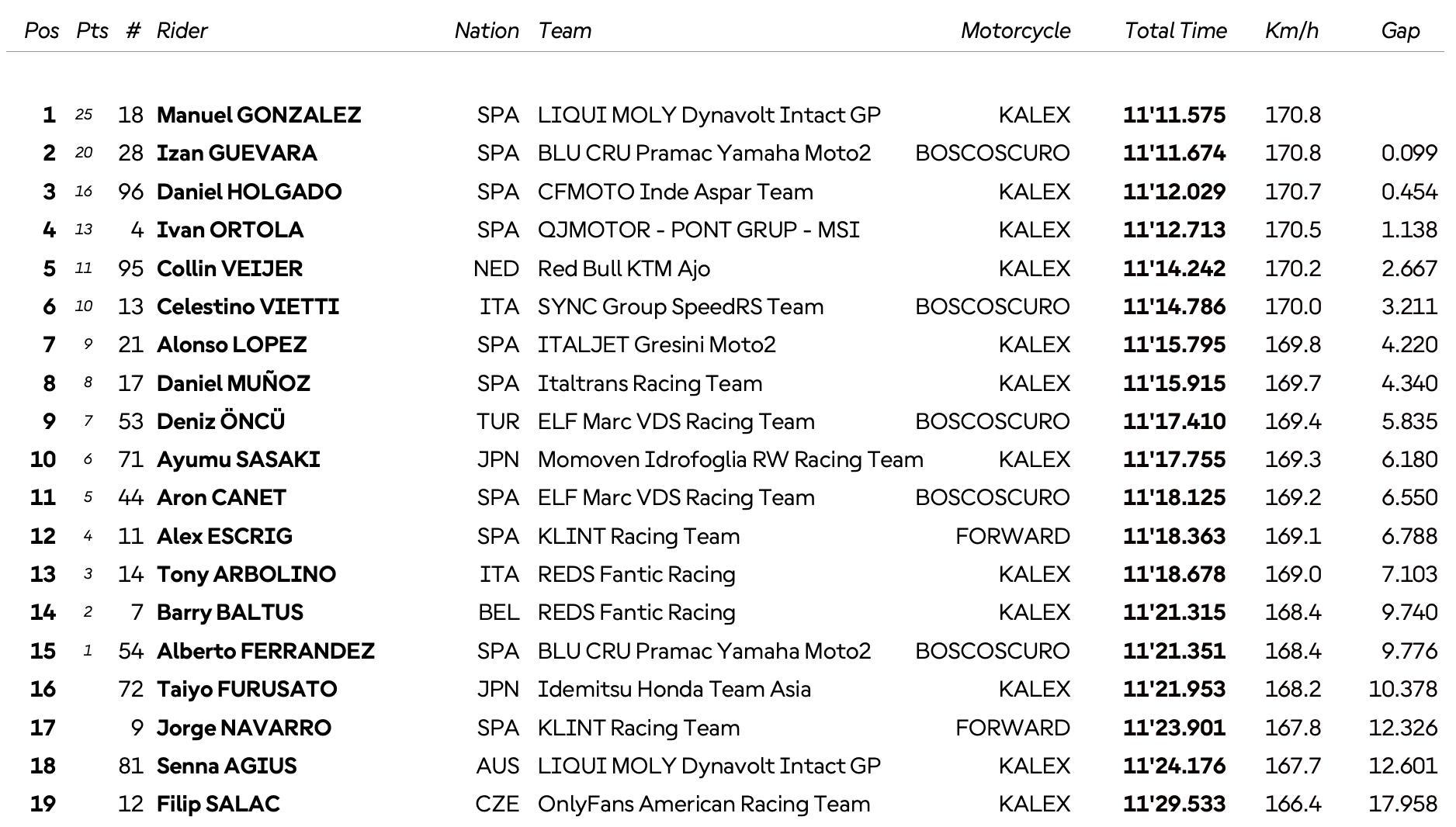 Sur cette distance réduite, un groupe de quatre pilotes se détache pour jouer la gagne : Manuel Gonzalez, Izan Guevara, Daniel Holgado et Ivan Ortola. Gonzalez réussit à prendre l’ascendant et s’impose sur le fil face à Guevara, avec une marge de 0.099s. Holgado monte sur la troisième marche du podium (+0.454s), laissant Ortola à la quatrième place.