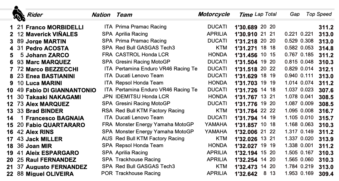 Sous un soleil de plomb et une chaleur étouffante, Franco Morbidelli s'est montré le plus rapide de la séance avec un tour en 1'30.689. L'Italien a conclu la FP1 avec plus de deux dixièmes d'avance sur Maverick Viñales et plus d'une demi-seconde sur une autre Ducati GP24, celle de Jorge Martin.