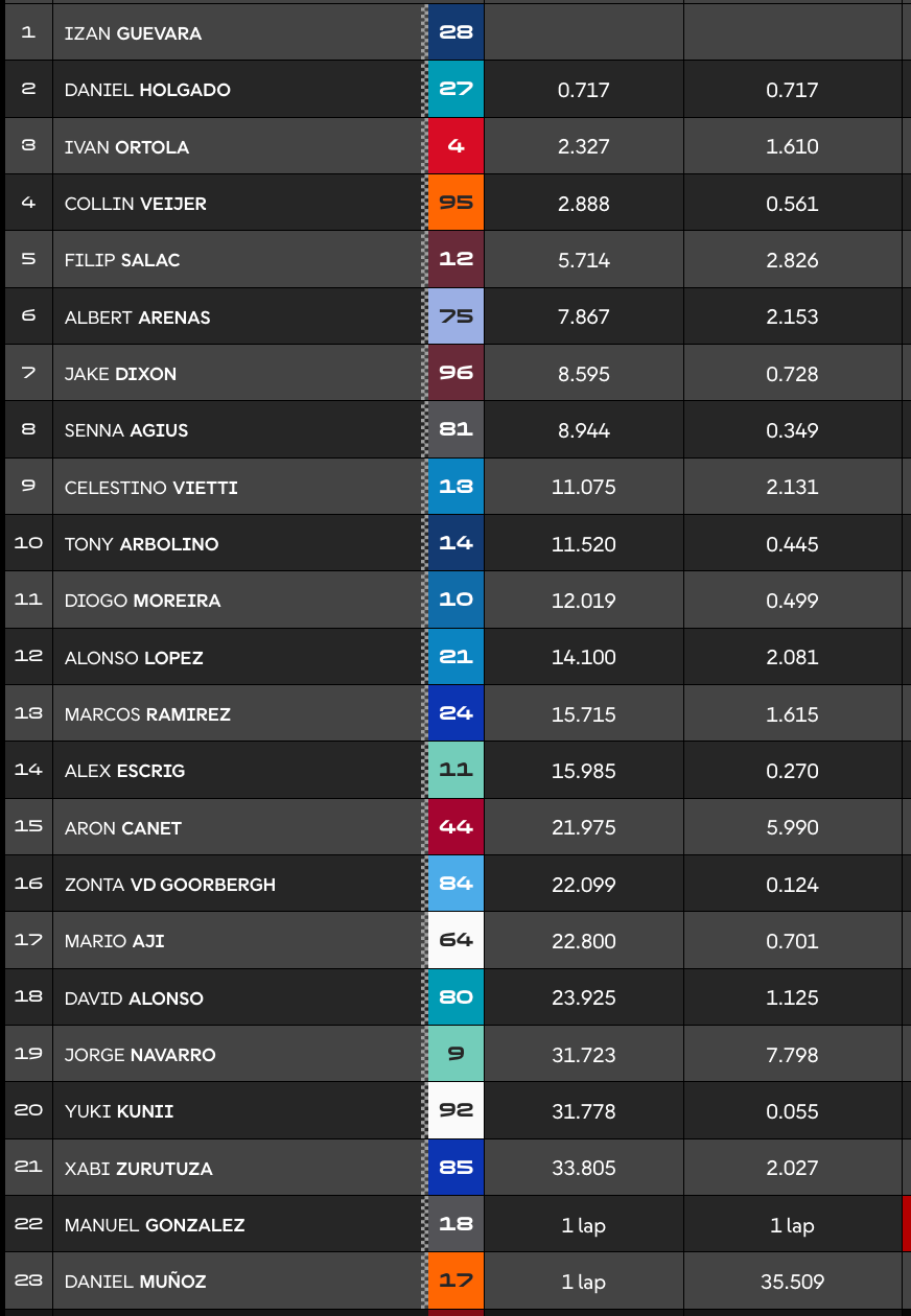 La victoire de cette ultime course s’est jouée entre Izan Guevara et Dani Holgado. Les deux Espagnols ne se sont pas quittés d’une semelle et c’est finalement Guevara qui a obtenu le dernier mot pour décrocher sa première victoire en Moto2 et devenir le 11e vainqueur différent de la saison.