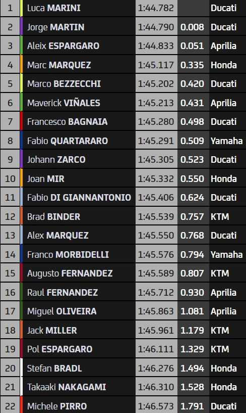 Francesco Bagnaia connaît un début de week-end délicat mais il a assuré l’essentiel en terminant septième, dans le même dixième que Marco Bezzecchi (cinquième) et Maverick Vinales (sixième) juste devant lui. Johann Zarco (neuvième) n’est guère plus loin et évite lui aussi un passage par la séance de repêchage, où l’on retrouvera toutes les KTM du plateau. Le constructeur autrichien est le perdant du jour, avec pour meilleur représentant Brad Binder en douzième position.