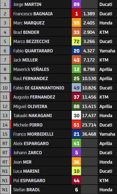 Championnat MotoGP : 1. Bagnaia 292 pts, 2. Martin 259 (-33), 3. Bezzecchi 223 (-69), 4. Binder 179 (-113, 5. A. Espargaro 160 (-132)… Classement complet ici