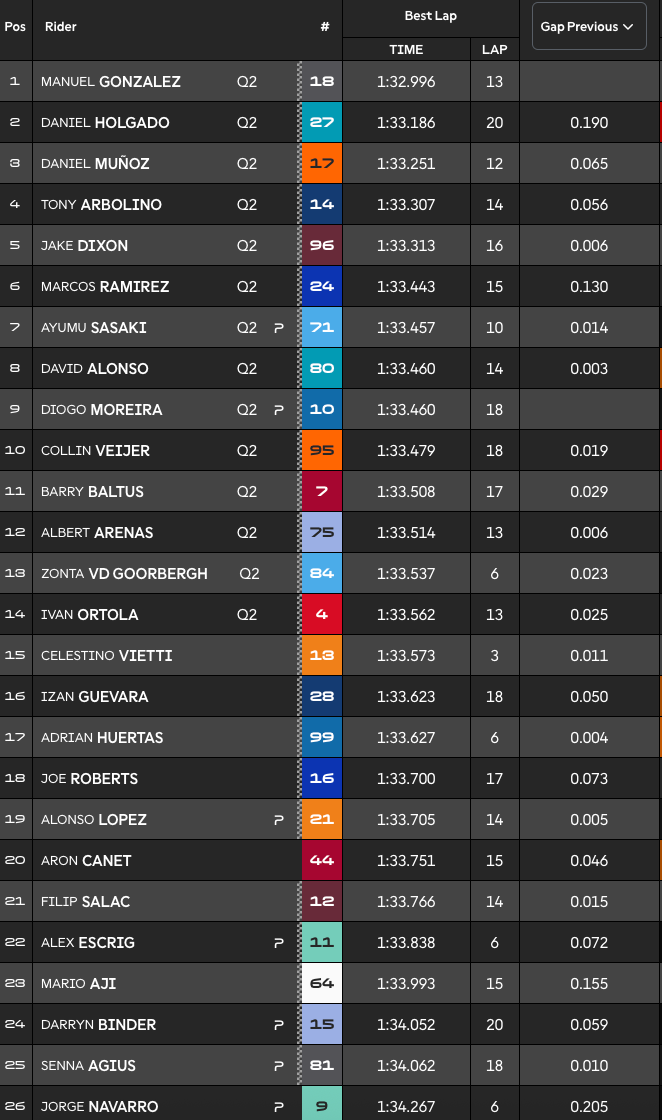 Manuel Gonzalez décroche le meilleur temps de cette Pratice (1'32.996), suivi par Daniel Holgado (1'33.186) et l'étonnant Daniel Muñoz (1'33.186). Tony Arbolino et Jake Dixon complètent le Top 5 et passeront directement en Q2 demain.