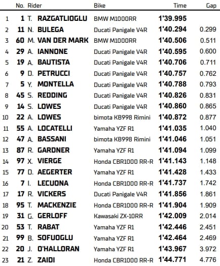 Un problème technique en FP1 n'a pas empêché Toprak Razgatlioglu de dominer la deuxième séance d'essais libres World Superbike à Portimao, devançant le leader du championnat Nicolo Bulega. Michael van der Mark place une seconde BMW dans le top-3, suivi par six Ducati. Les marques allemande et italienne occupent l'intégralité du top-9 !