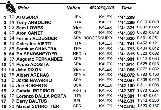 Ai Ogura a signé ce samedi sa première pole en catégorie Moto2 à Jerez, avec une avance infime sur le duo du team Marc VDS, Tony Arbolino (2e) et Sam Lowes (3e). Aron Canet (4e) ouvrira la deuxième ligne malgré sa blessure au bras. Le leader du championnat, Celestino Vietti (6e), fermera cette deuxième rangée. Entré directement en Q2, le Belge Barry Baltus s’élancera 17e.
