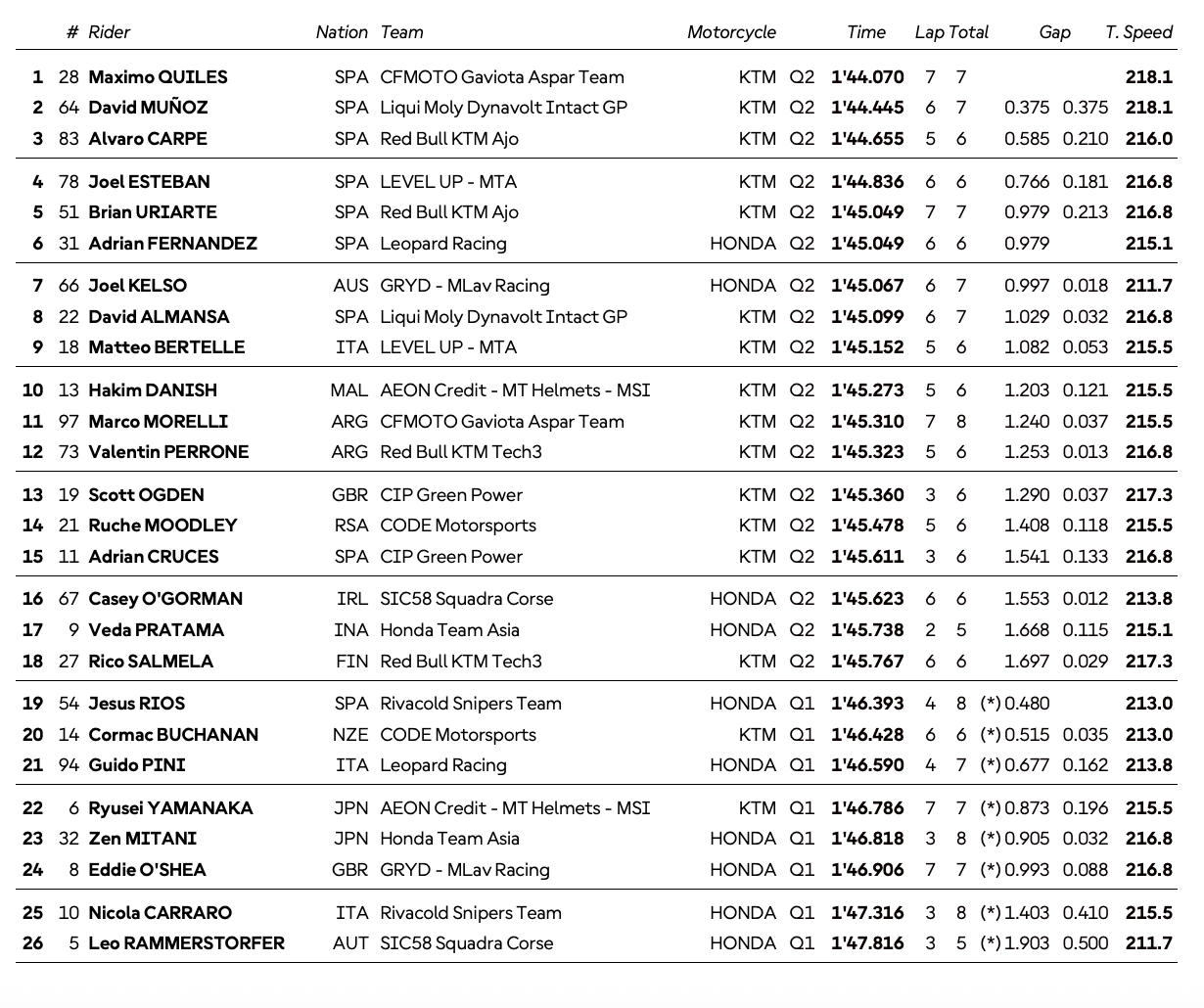 David Muñoz, de retour après une lourde chute en Indonésie, opéré une sixième fois il y a quinze jours, décroche le deuxième chrono (1'44.445) et s'élancera en première ligne, devant Alvaro Carpe.