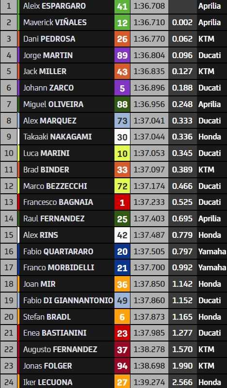 Jorge Martin (4e, +0.096) reste meilleur pilote Ducati grâce à son temps du matin, rejoignant par la KTM RC16 de Jack Miller, vainqueur ici en 2021, au 5e rang (+0.127). Le coéquipier du Martinator, Johann Zarco, a réussi à se faufiler dans le top-10 directement qualificatif pour la Q2 dans les tous derniers instants. Le pilote de l’équipe Prima Pramac Racing se classe 6e (+0.188) et s’évite, comme Miguel Oliveira (7e), Alex Marquez (8e), Takaaki Nakagami (9e) meilleur pilote Honda et Luca Marini (10e), une séance de repêchage qui s’annonce corsée.