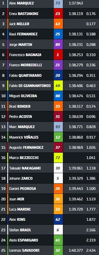 Marco Bezzecchi est également tombé lors de cette séance d'un peu moins de 10 minutes (elle a été arrêtée à 53 secondes du terme), dominée par Alex Marquez en 1'37.943.