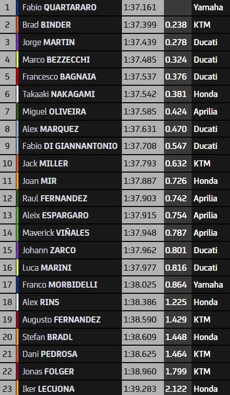 Fabio Quartararo a signé le meilleur temps du warm-up à Jerez, ce dimanche matin, avec un chrono proche de la barre des 1’36. Le vainqueur du sprint, Brad Binder, s’est aussi levé du bon pied (2e), comme le leader du championnat Marco Bezzecchi (4e) et son dauphin Francesco Bagnaia (5e). Course Moto3 à 12h, Moto2 à 13h et MotoGP à 15h