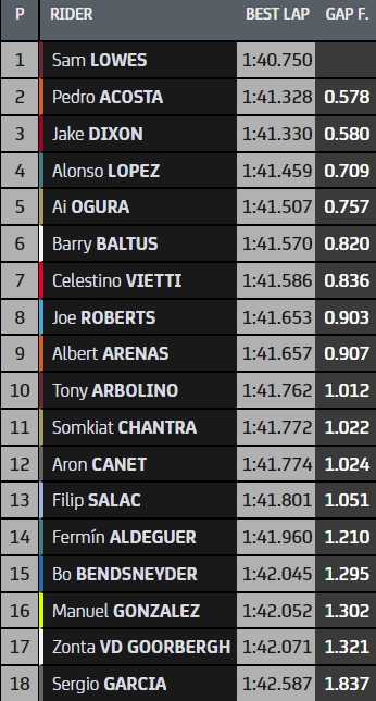 Vainqueur à Jerez en Moto2 en 2016, Sam Lowes a signé ce samedi la 19e pole position de sa carrière, et avec la manière : une demi-seconde d’avance sur Pedro Acosta. Le leader du championnat, Tony Arbolino, n’est pas au mieux (10e). Le Belge Barry Baltus est lui plus rapide que jamais et signe, sixième, la meilleure qualification de sa jeune carrière.